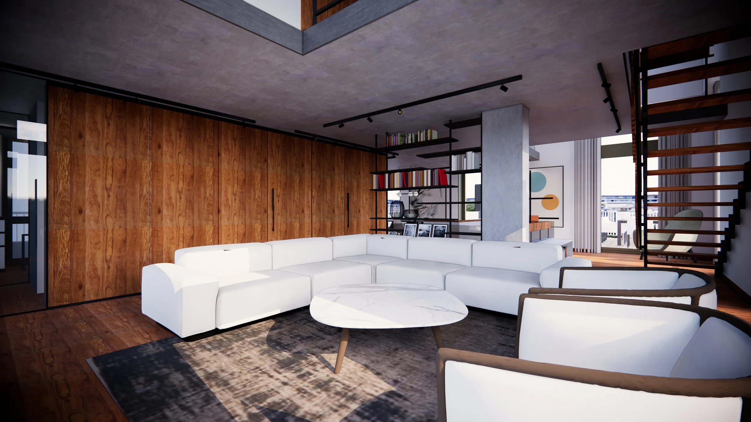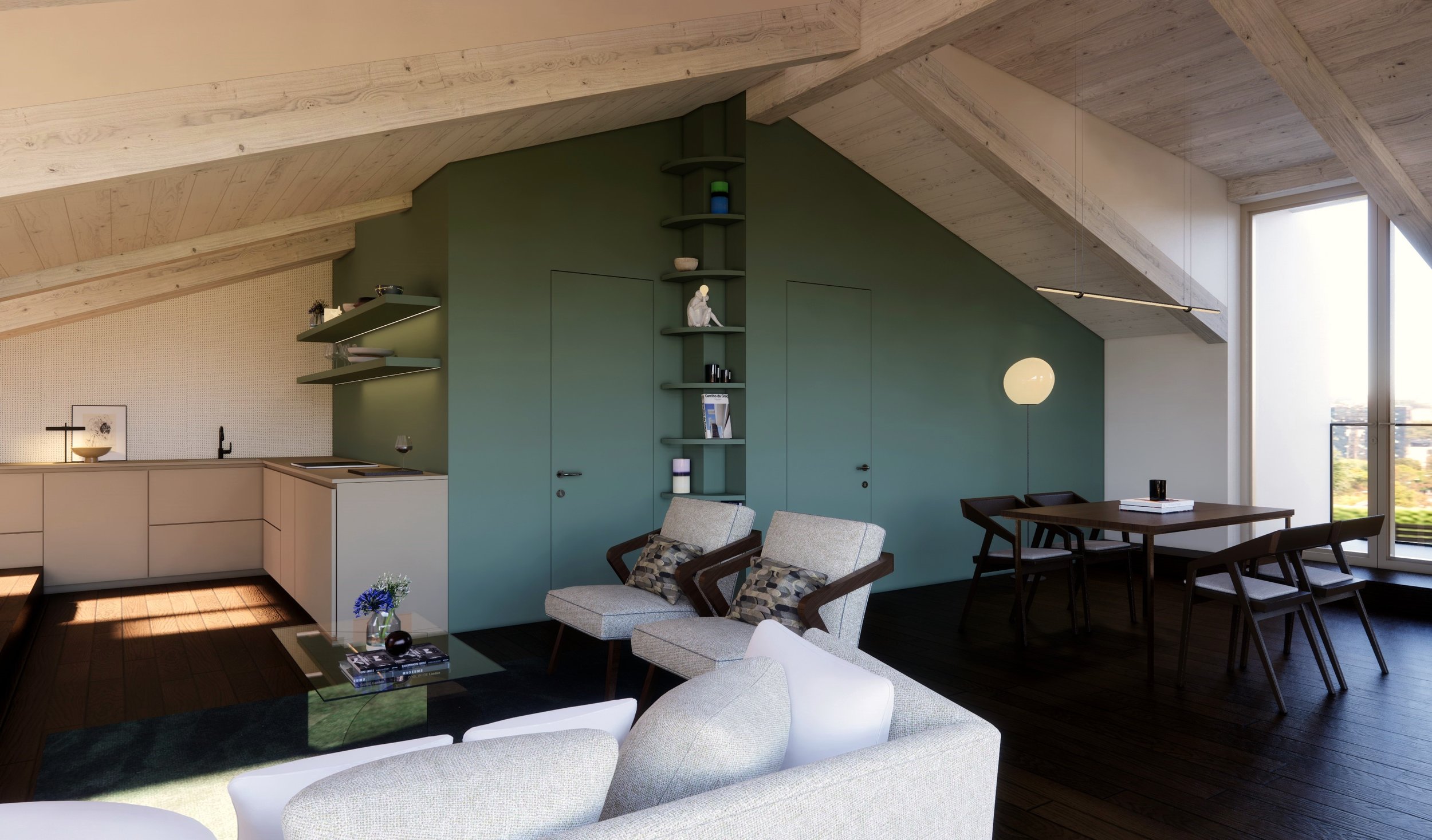 The apartment occupies the top floor of the building located along the central Via Roma. It is designed as a “Turret” with a square floor plan, developed over two levels. Each of the four sides features large floor-to-ceiling windows that offer a 360° panoramic view of the city and surrounding hills, while also allowing natural light to become a key element of the design.
