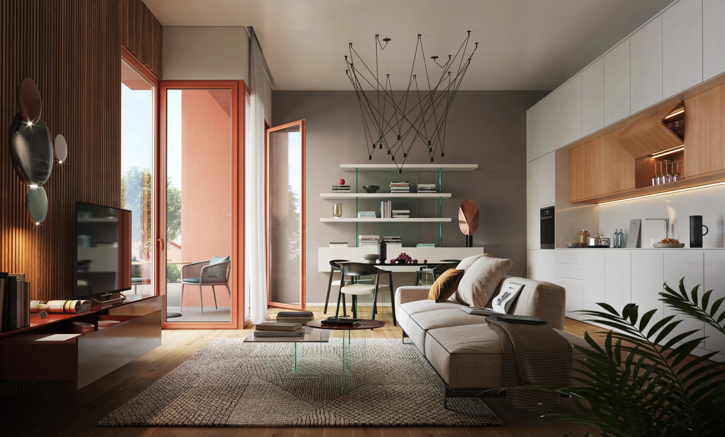 The result involves the construction of 39 residential apartments. In particular, apartments of distinctive value will be created on the main floor through the complete restoration of the historic frescoed vaults and the noble hall that belonged to the counts of Masino. While on the fourth floor the penthouses will be equipped with large terraced outdoor spaces overlooking the historic center.